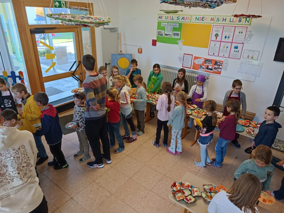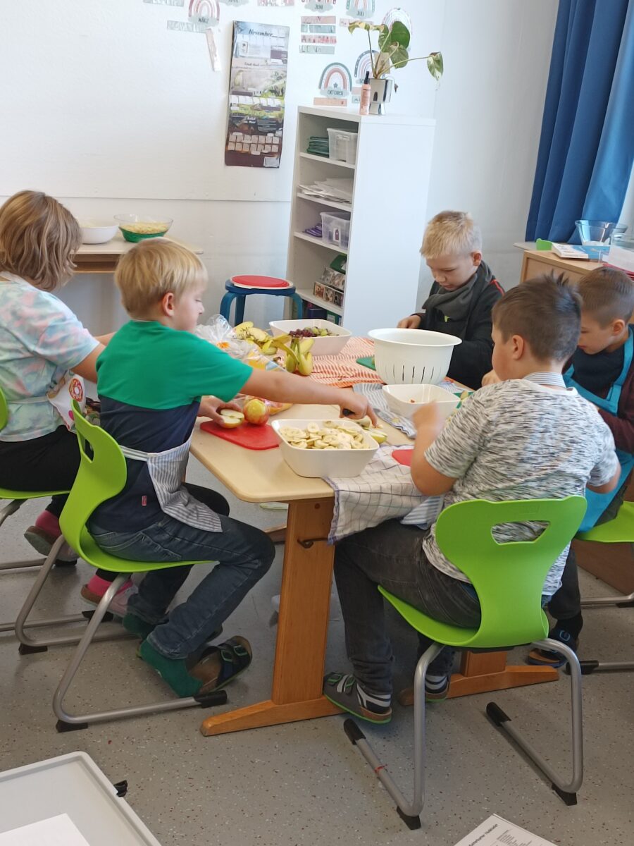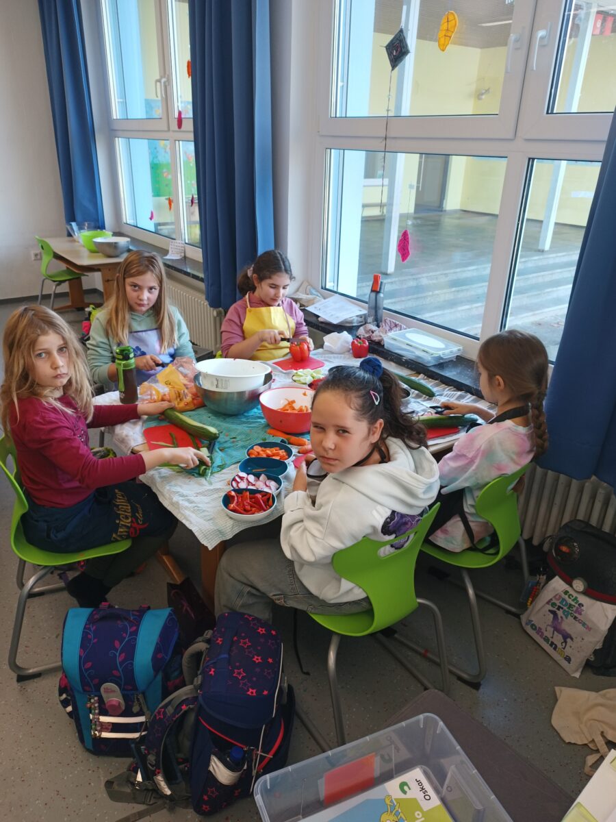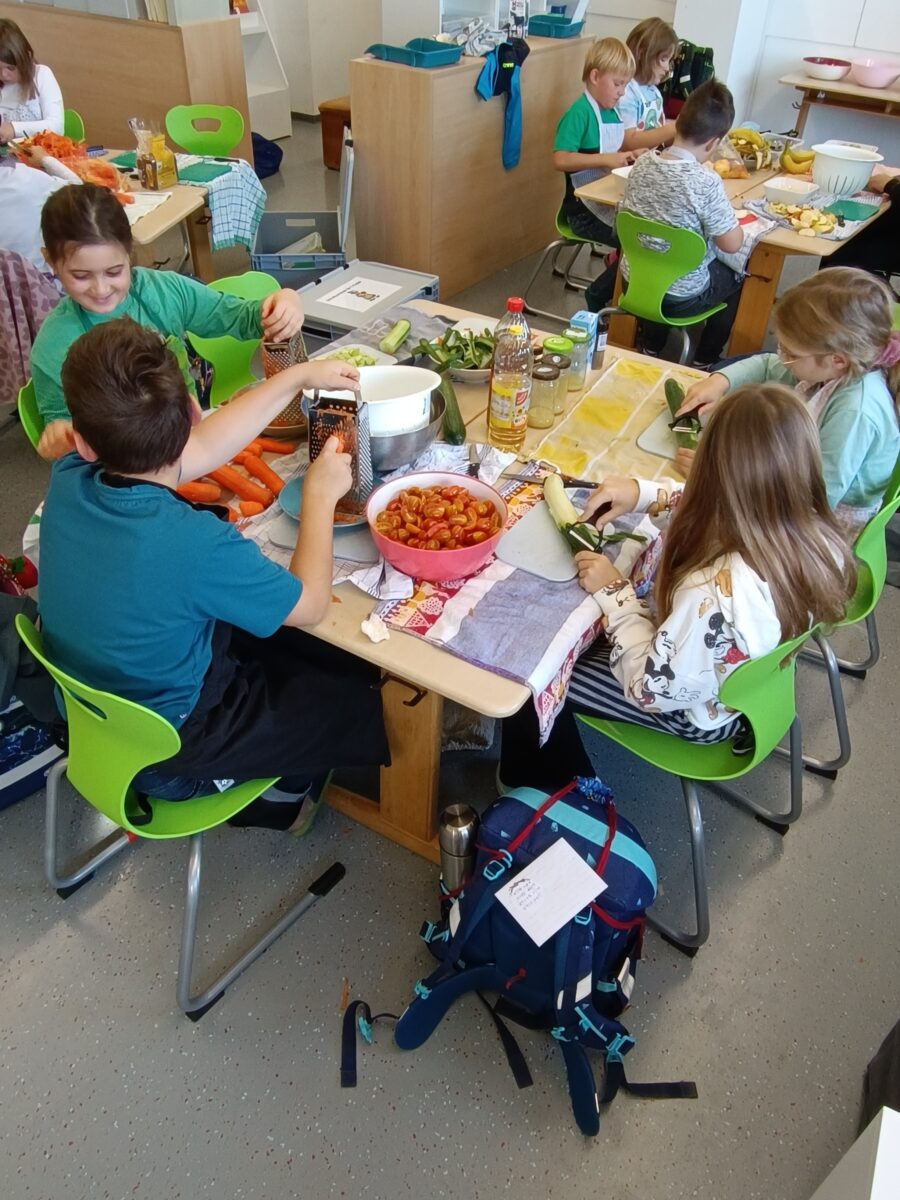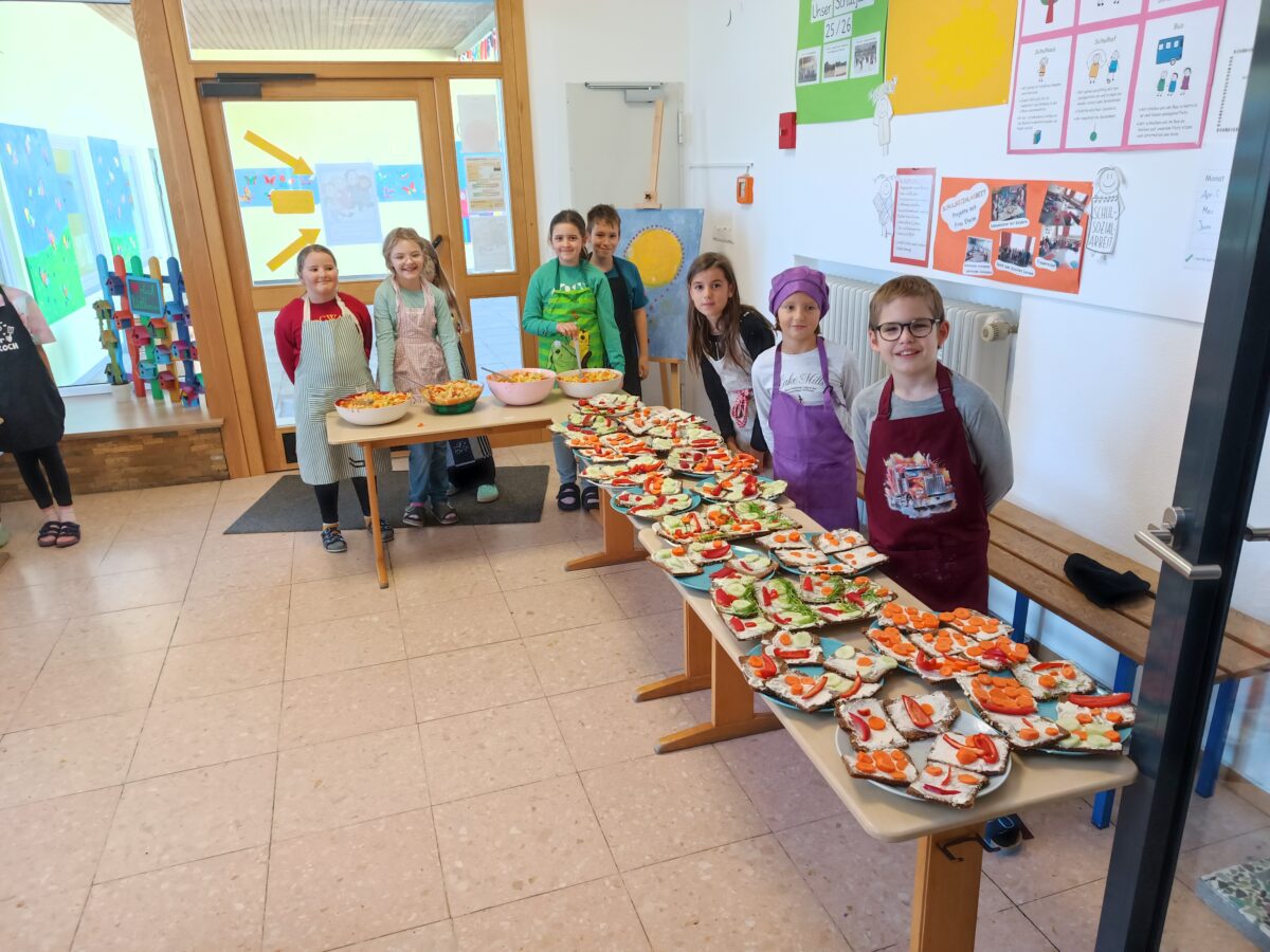 Nach vier Doppelstunden Übungszeit war es endlich soweit: die Drittklässler durften in der praktischen Prüfung des Ernährungsführerscheins zeigen, was sie gelernt haben. Voller Stolz bereiteten sie ein buntes Buffet vor, an dem sich die ganze Schule bedienen durfte!